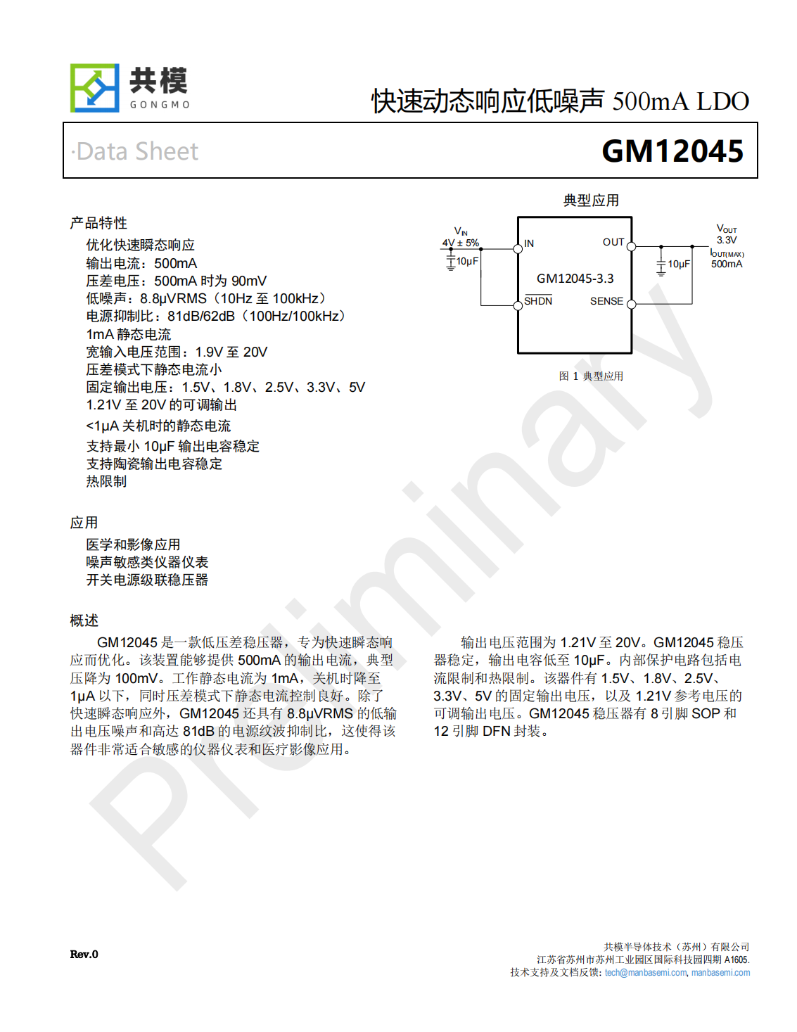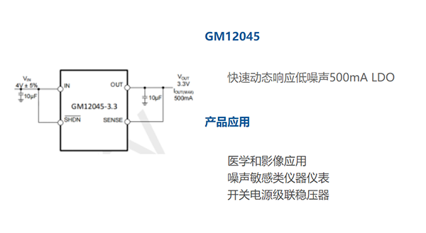 GM12045是一款低压差稳压器,专为快速瞬态响应而优化。该装置能够提供500mA的输出电流,典型压降为100mV。工作静态电流为1mA,关机时降至1μA以下,同时压差模式下静态电流控制良好。除了快速瞬态响应外,GM12045还具有8.8μVRMS的低输出电压噪声和高达81dB的电源纹波抑制比,这使得该器件非常适合敏感的仪器仪表和医疗影像应用。