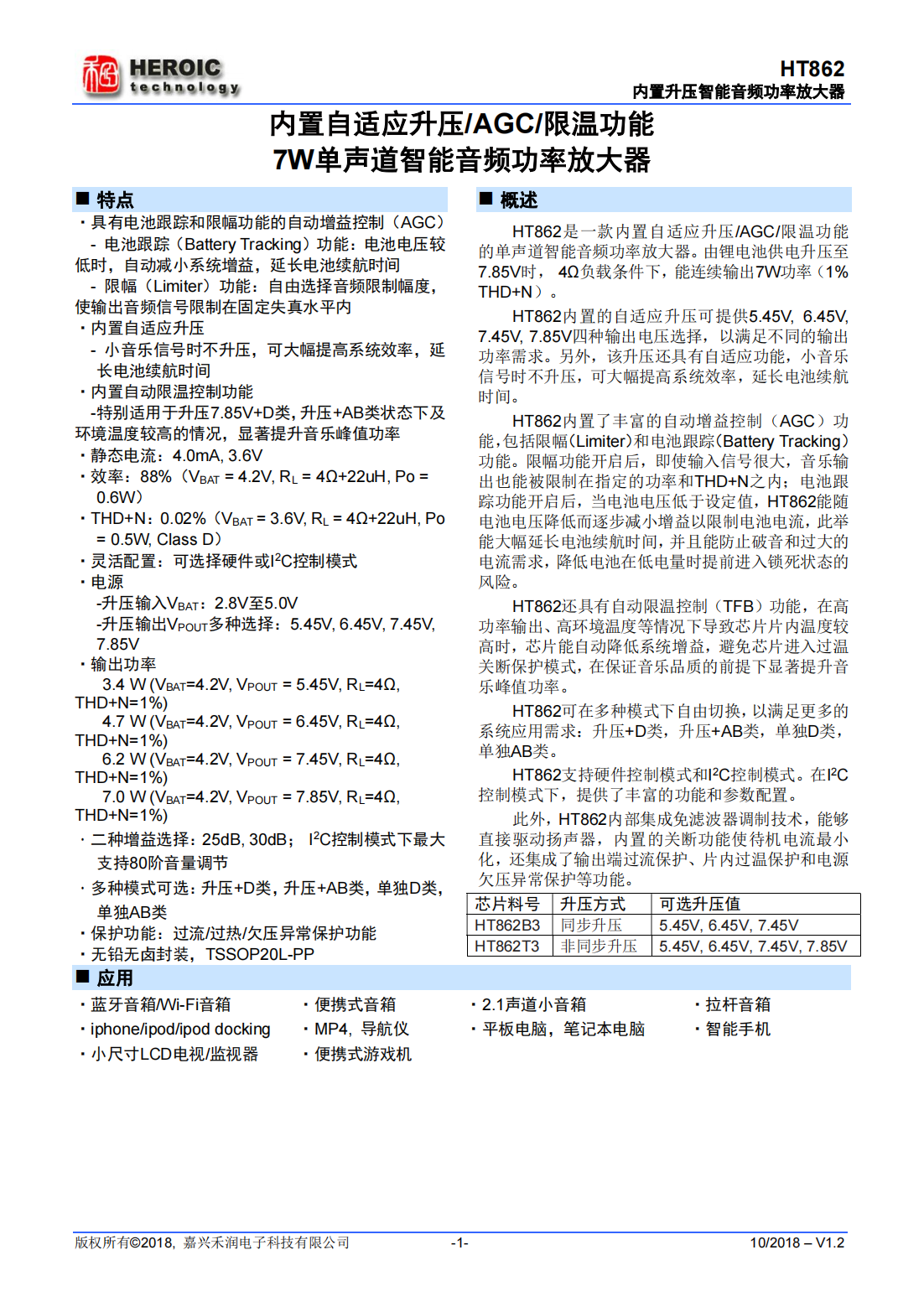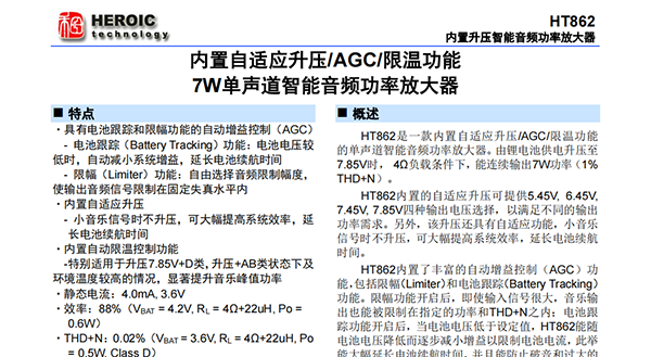 HT862是一款内置自适应升压/AGC/限温功能的单声道智能音频功率放大器。由锂电池供电升压至7.85V时,4Ω负载条件下,能连续输出7W功率(1%THD+N)。