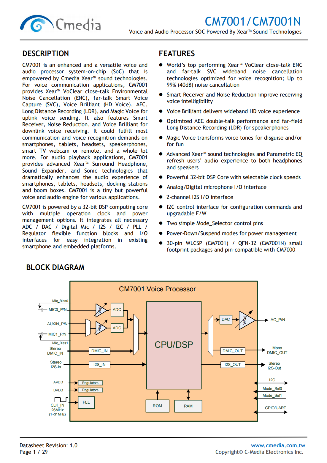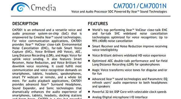 CM7001 is an enhanced and a versatile voice and audio processor system-on-chip (SoC) that is empowered by Cmedia Xear™ sound technologies