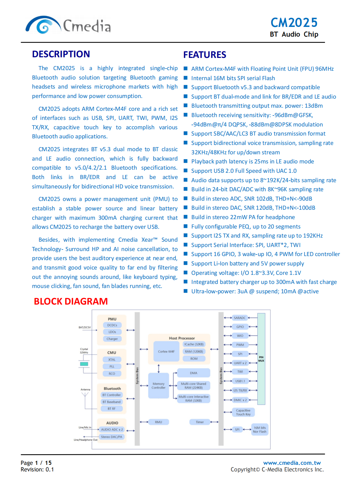 CM2025拥有一个电源管理单元(PMU),用于建立稳定的电源和最大充电电流为300mA的线性电池充电器,使CM2025能够通过USB为电池充电。此外,通过实施Cmedia Xear™声音技术环绕HP和AI降噪,为用户提供近端最佳的听觉体验,并通过过滤掉周围恼人的声音,如键盘打字、鼠标点击、风扇声音、风扇叶片运行等,将良好的音质传给远端。