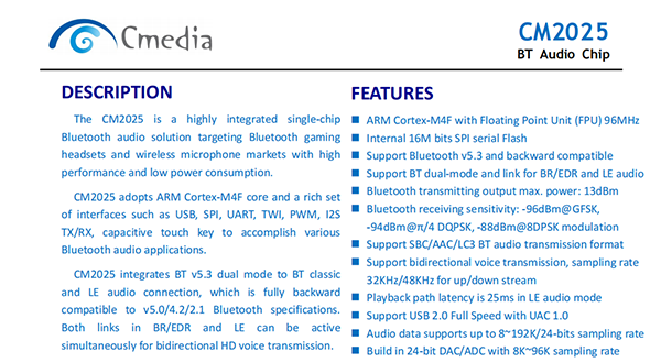 CM2025是一款高度集成的单芯片蓝牙音频华体会网页版登录入口,针对蓝牙游戏耳机和无线麦克风市场,具有高性能和低功耗。